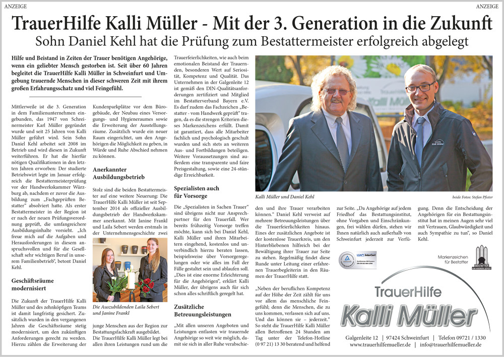 Kürzlich ist in der Mainpost ein ausführlicher Artikel über unser Bestattungshaus erschienen. In dem detaillierten Firmenportrait wird unter anderem auf die modernisierten Geschäftsräume, die Anerkennung als offizieller Ausbildungsbetrieb und die Bestattungsvorsorge eingegangen.